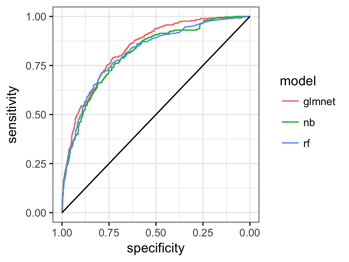 Caret offers a huge range of models to choose from, many with sophisticated regularisation features. Here, I’ll compare three models: 1) Naive Bayes (simple model we started to explore via plots last time), 2) GLMnet, a linear method: logistic regression with lasso or elastic net regularisation, and 3) Random forest, a non-linear method with regularisation via tree depth.