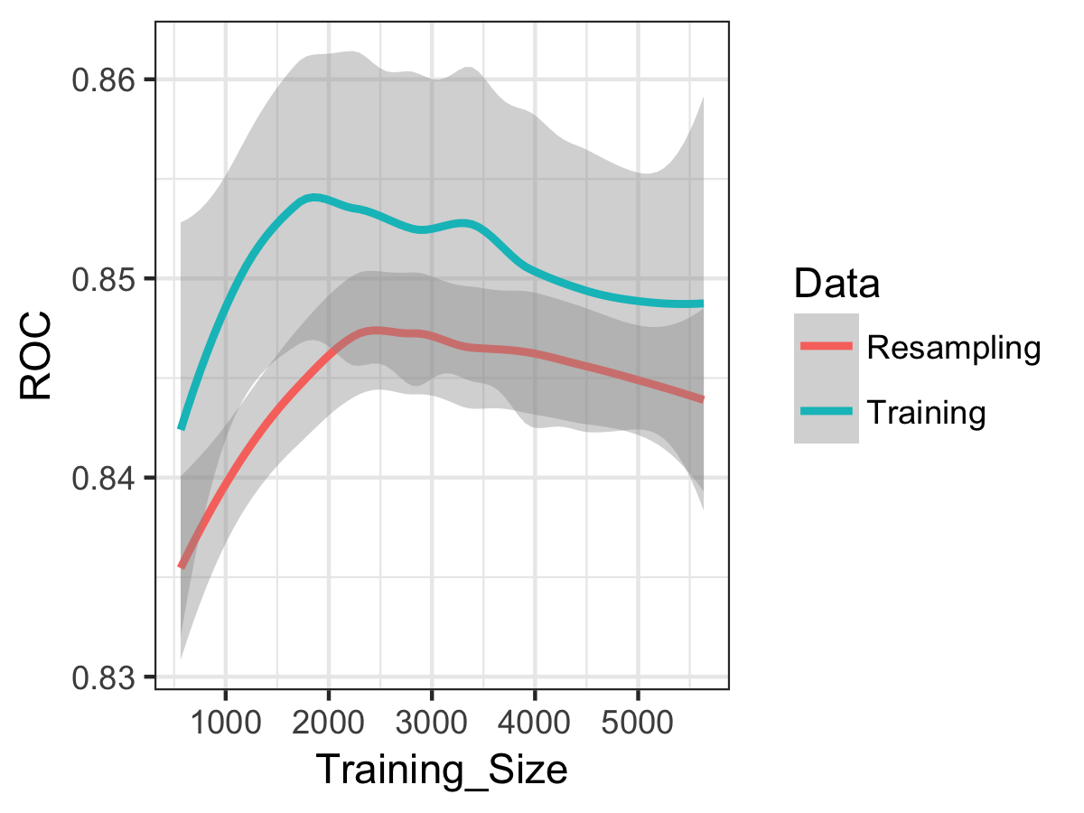 We see that error in the model is increasing (i.e. ROC decreases), and the training and resampling errors are changing roughly in parallel. So the model is suffering from bias rather than variance, and more data (from the same distribution) would not likely produce a better-performing and generalisable model. For more on learning, curves, I’d recommend the useful notes here.