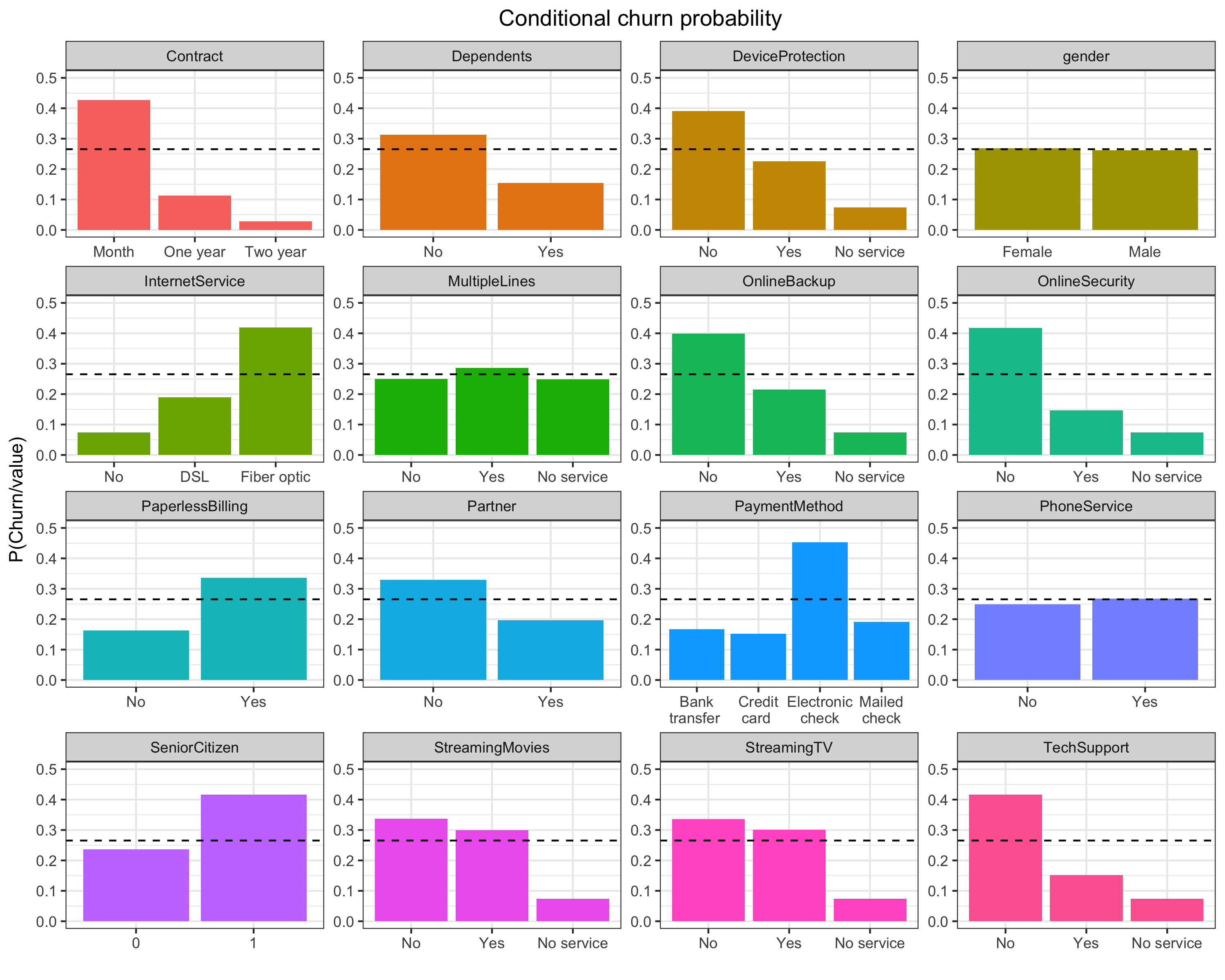 Finally, let’s take a closer look at churn probabilities for different categories, and calculate the probability of churn conditional upon category values