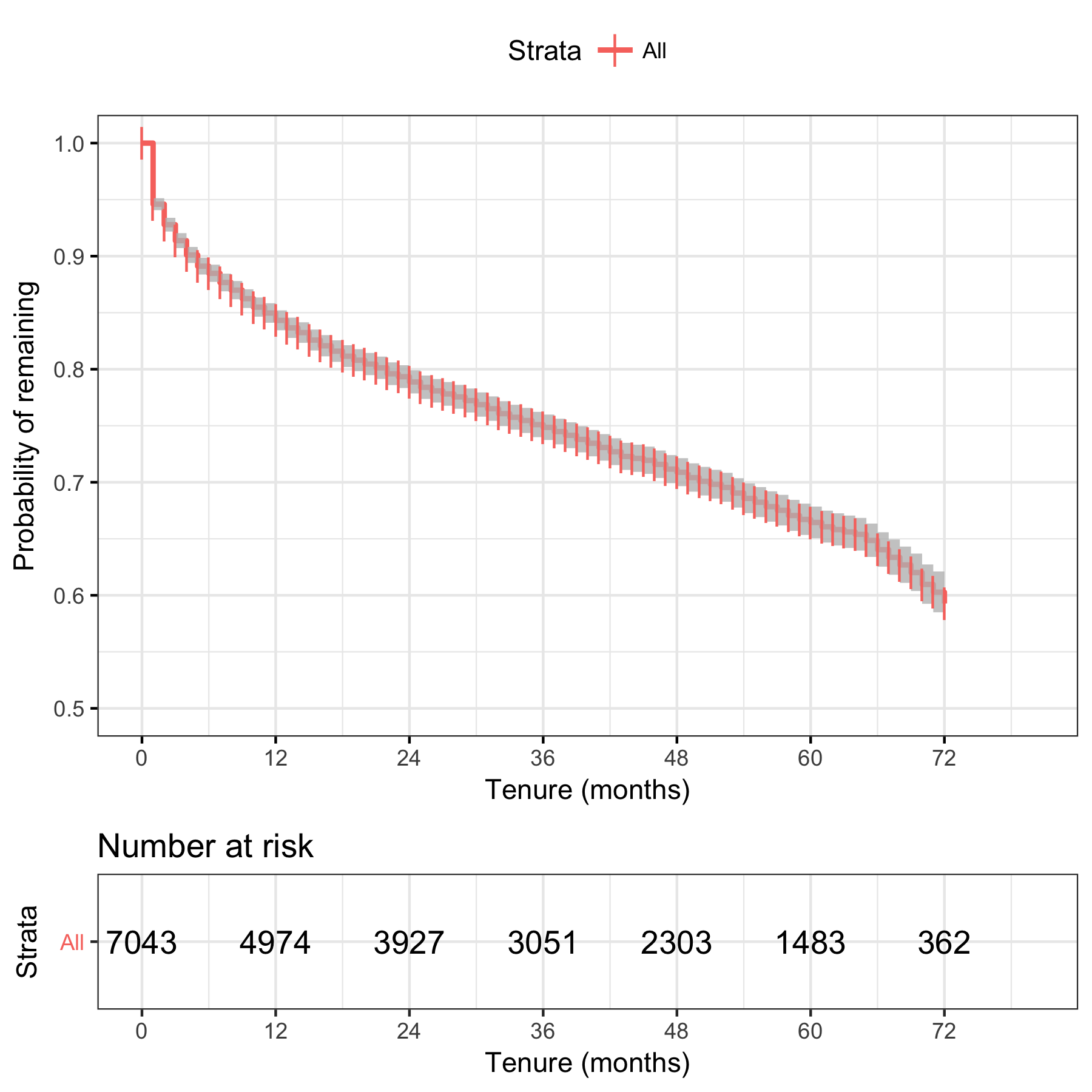 df.tel$survival <- Surv(df.tel$tenure, df.tel$Churn == "Yes")