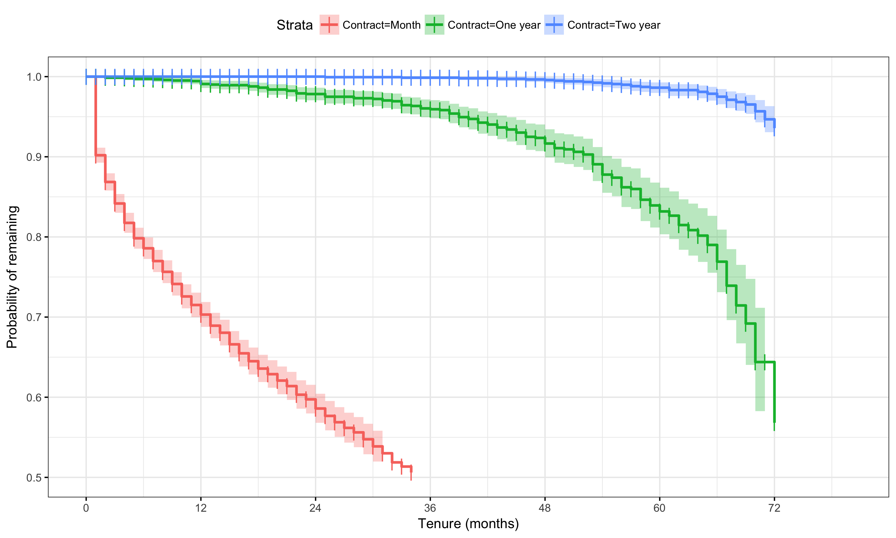 fit3 <- survfit(survival ~ Contract, data = df.tel)