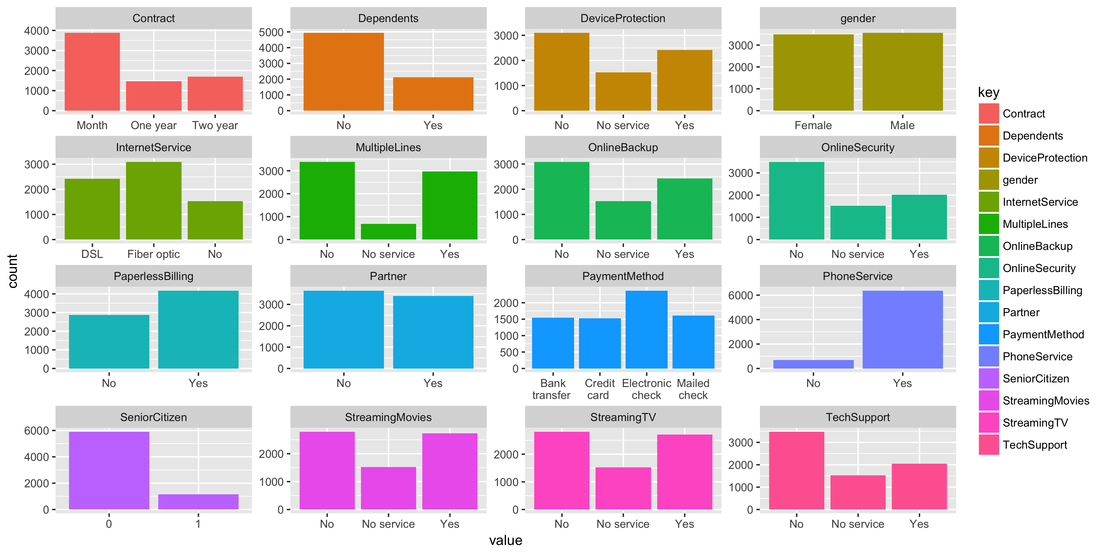 So we have 16 categorical variables, some of which are likely to overlap. Our dataset is fairly evenly gender balanced and most customers have a phone service and are not senior citizens.