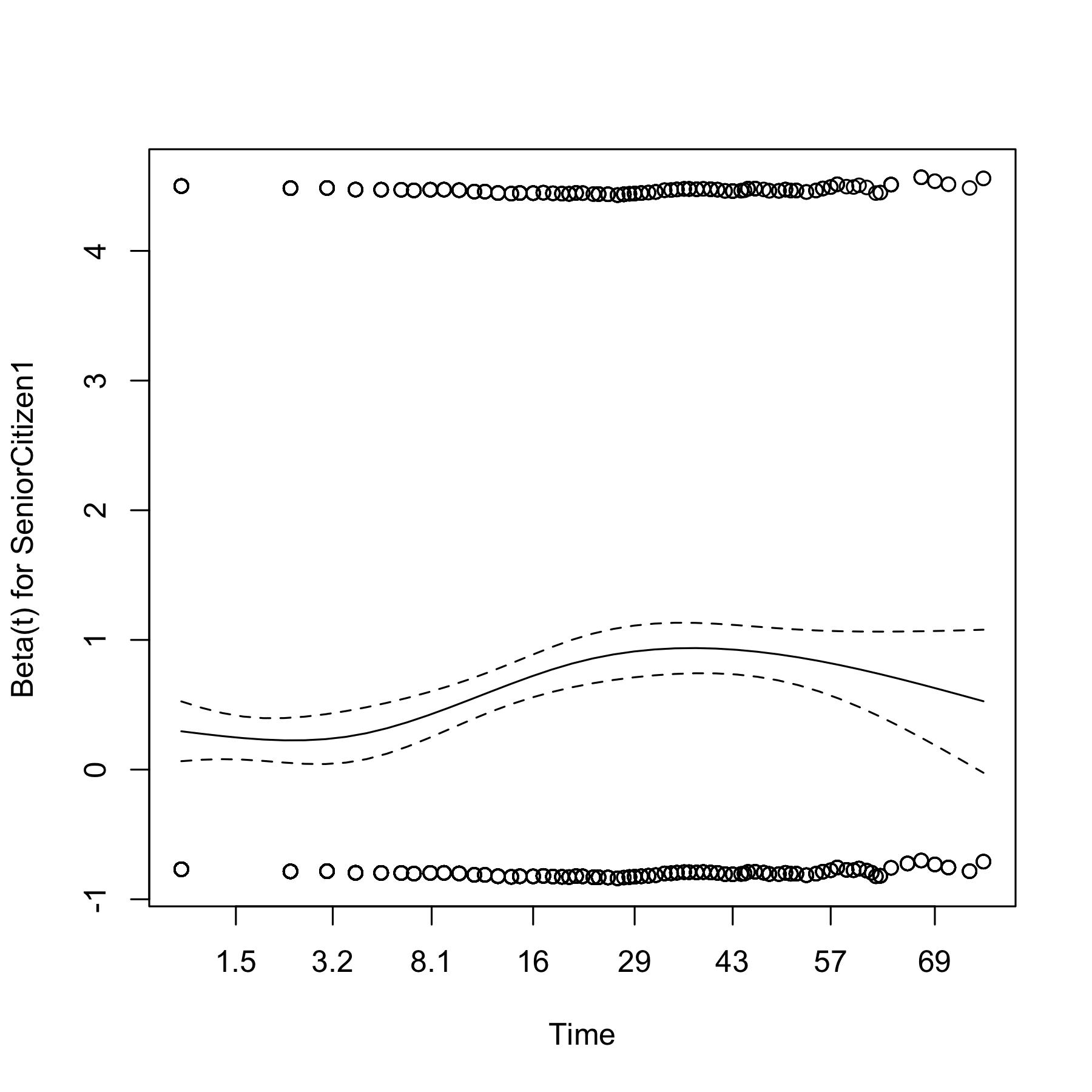 We see that the residuals are flat between approximately 1.5 to 3.2 months and around 30 to 40 months, but overall, they vary with time. The p-value of 1.89e-05 in the test here indicates that the residuals are significantly a function of tenure,and that consequently the proportional model does not apply. For this dataset, it turns out that the proportional hazards assumption is violated for many of the potential predictors, and that therefore this approach is of limited use.